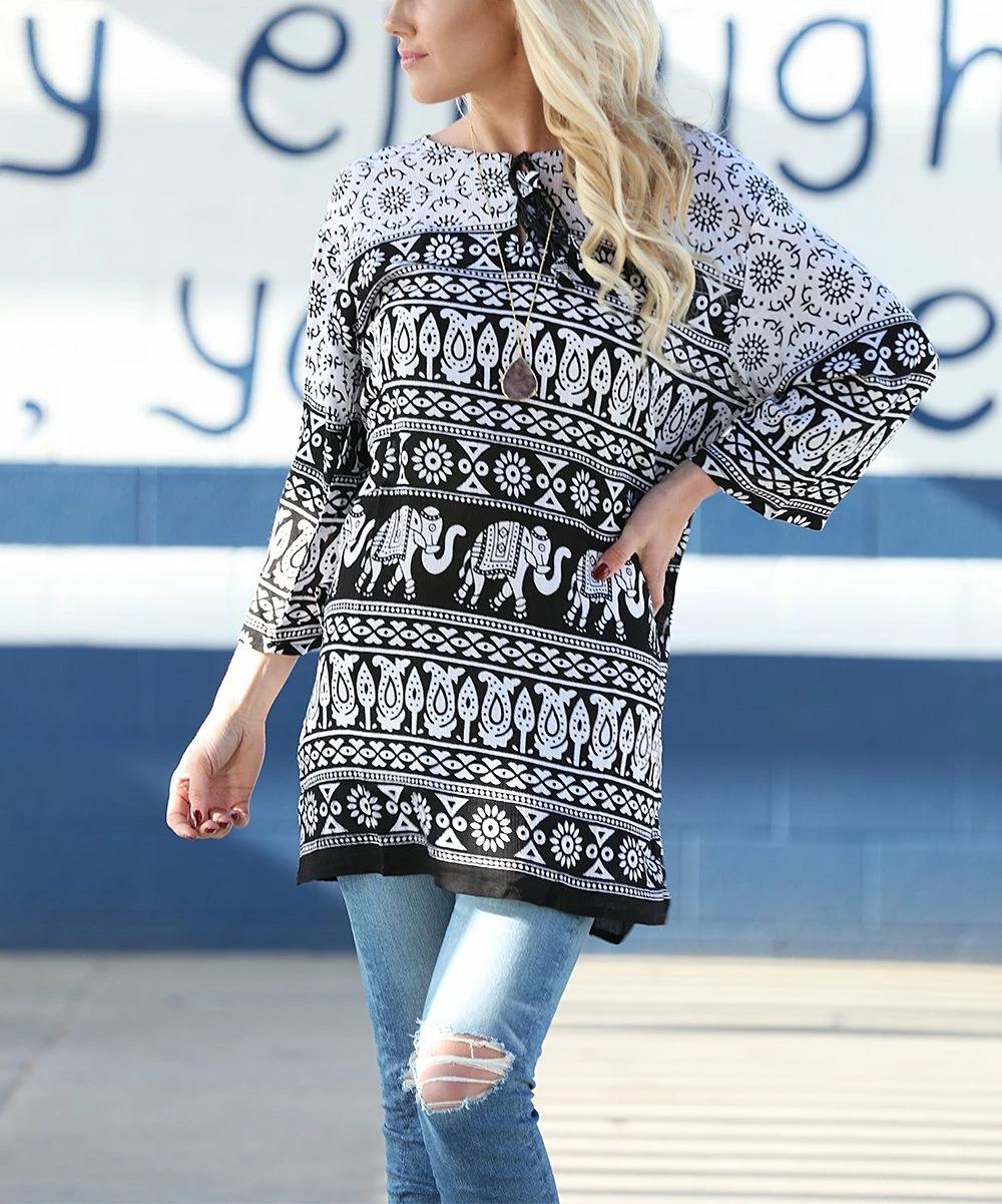 Enhance your outfits by pairing this long-sleeve and vibrantly-printed tunic with your favorite jeans or leggings.