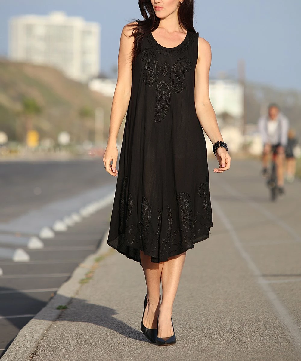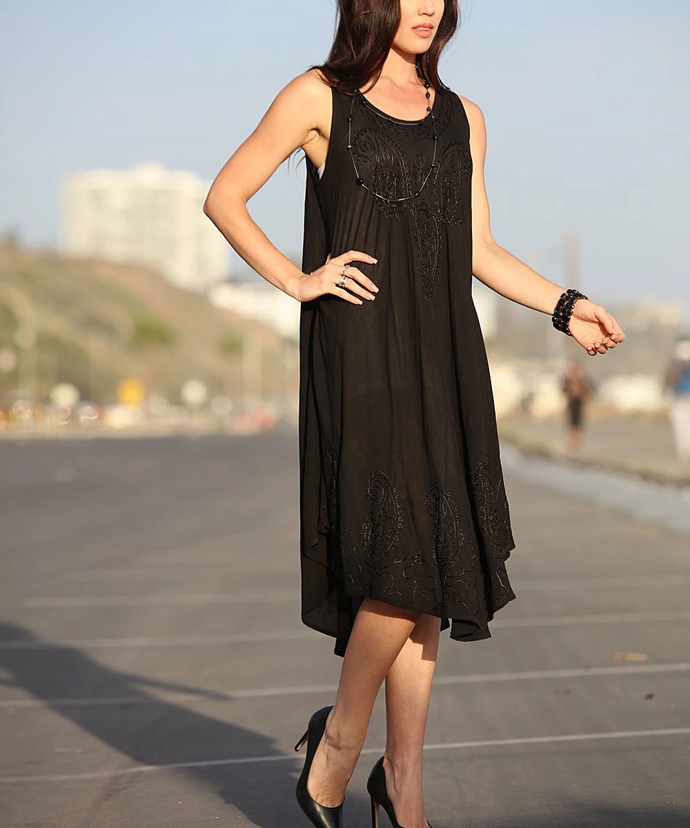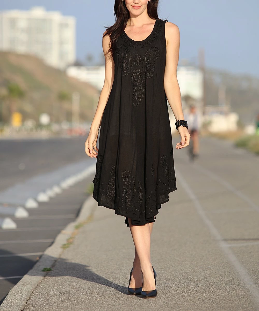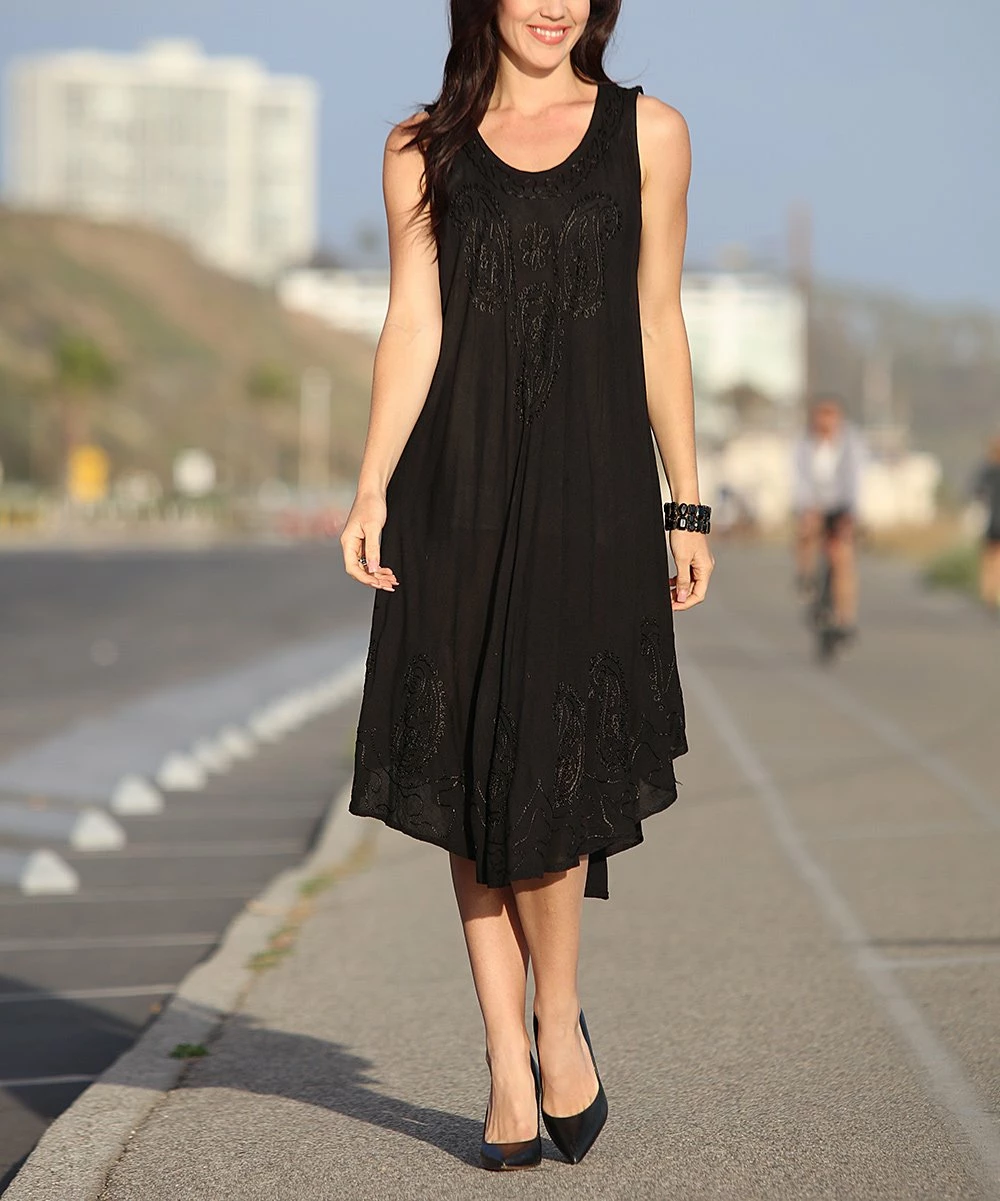With a chic asymmetrical hemline and elegant embroidery accents, this free-flowing midi flatters your figure in fashion-forward style.