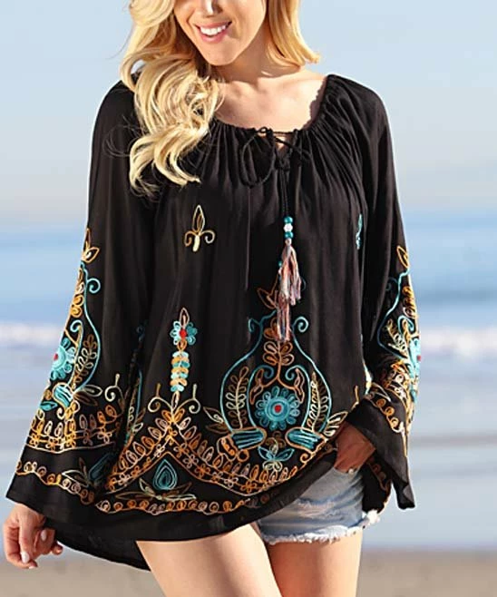 Colorful embroidery gives this bell-sleeve tunic boho style. A beaded tassel drawstring neckline enables on- or off-shoulder looks for versatile, weekend-friendly wear.