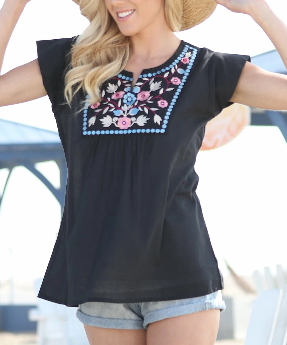 Floral embroidery lends an elegant update to this tunic, making it a charming addition to your casual look.