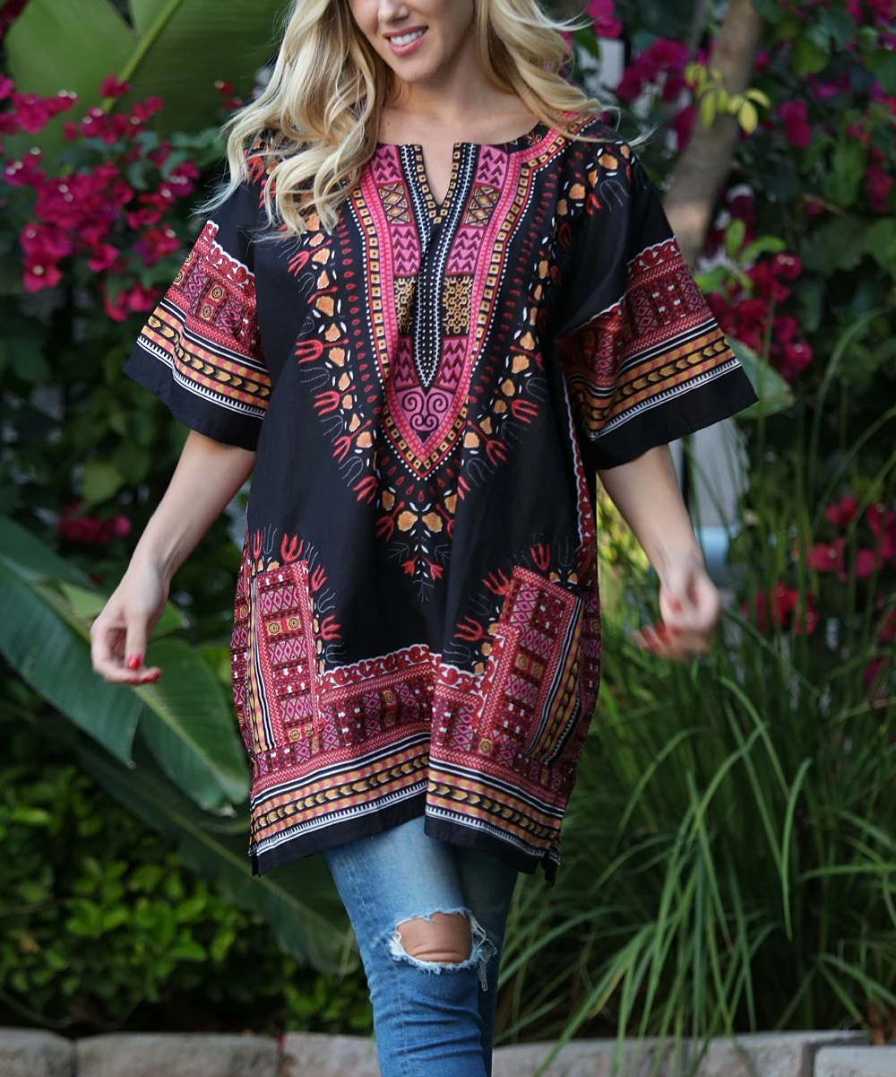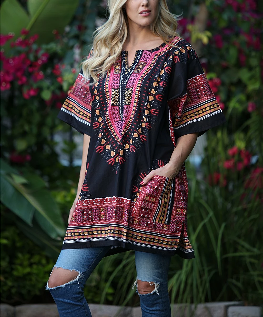 Ananda’s Collection | Black & Pink Geometric Pocket Notch Neck Tunic Dress – Plus