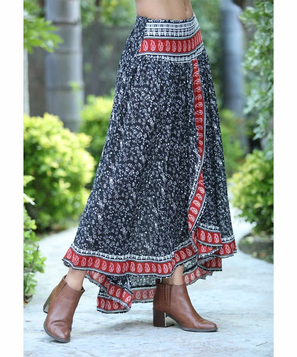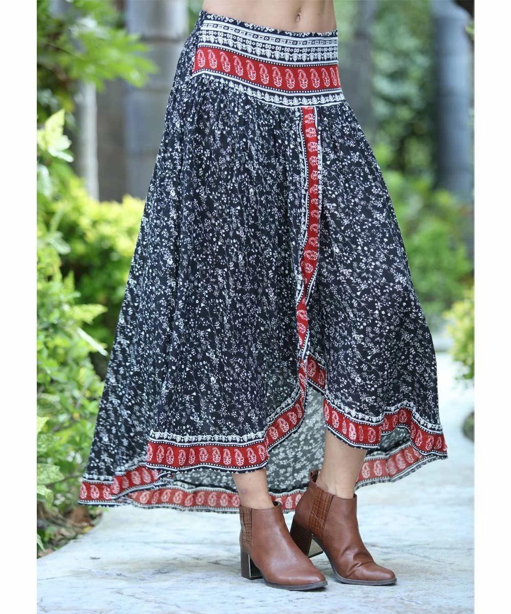 Bring out your bohemian side with this free-flowing maxi skirt adorned with a colorful print and leg-baring front slit.