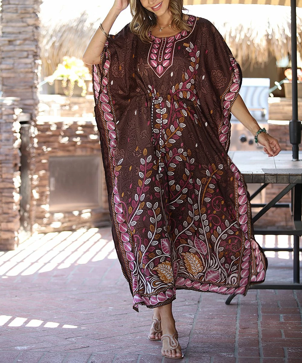 Go from your cabana to a seaside lunch in the comfort of this printed lightweight caftan featuring a billowy fit and flattering drawstring waist.