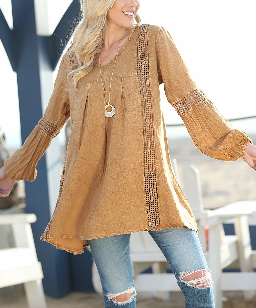 Whether paired with skinny jeans or leggings, this lightweight tunic lends easygoing style to your look thanks to its bloused sleeves and cutout design.