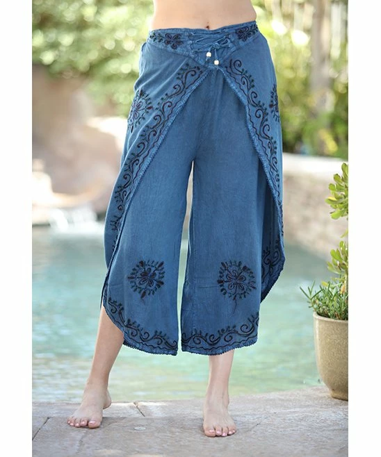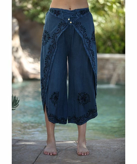 Bring a flowy staple to your casual collection with these wide-leg pants cut from lightweight fabric finished with intricate embroidered details.