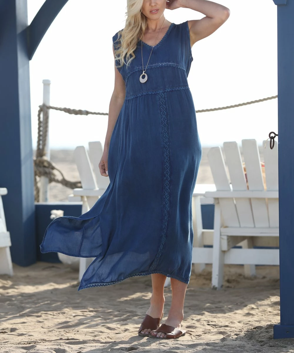 Channel your inner boho babe in this sleeveless maxi dress crafted with crocheted trim and silky soft fabric for comfortably casual wear.