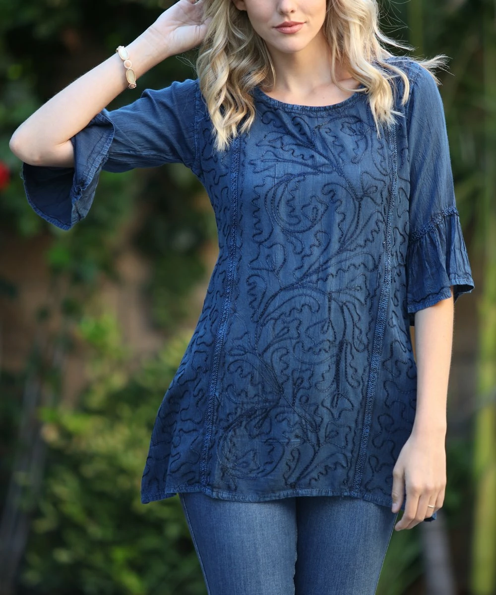 Crafted with allover embroidery, this three-quarter sleeve tunic adds bohemian flair to your ensembles.