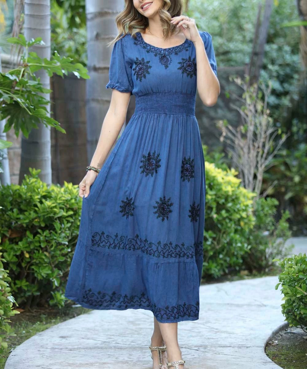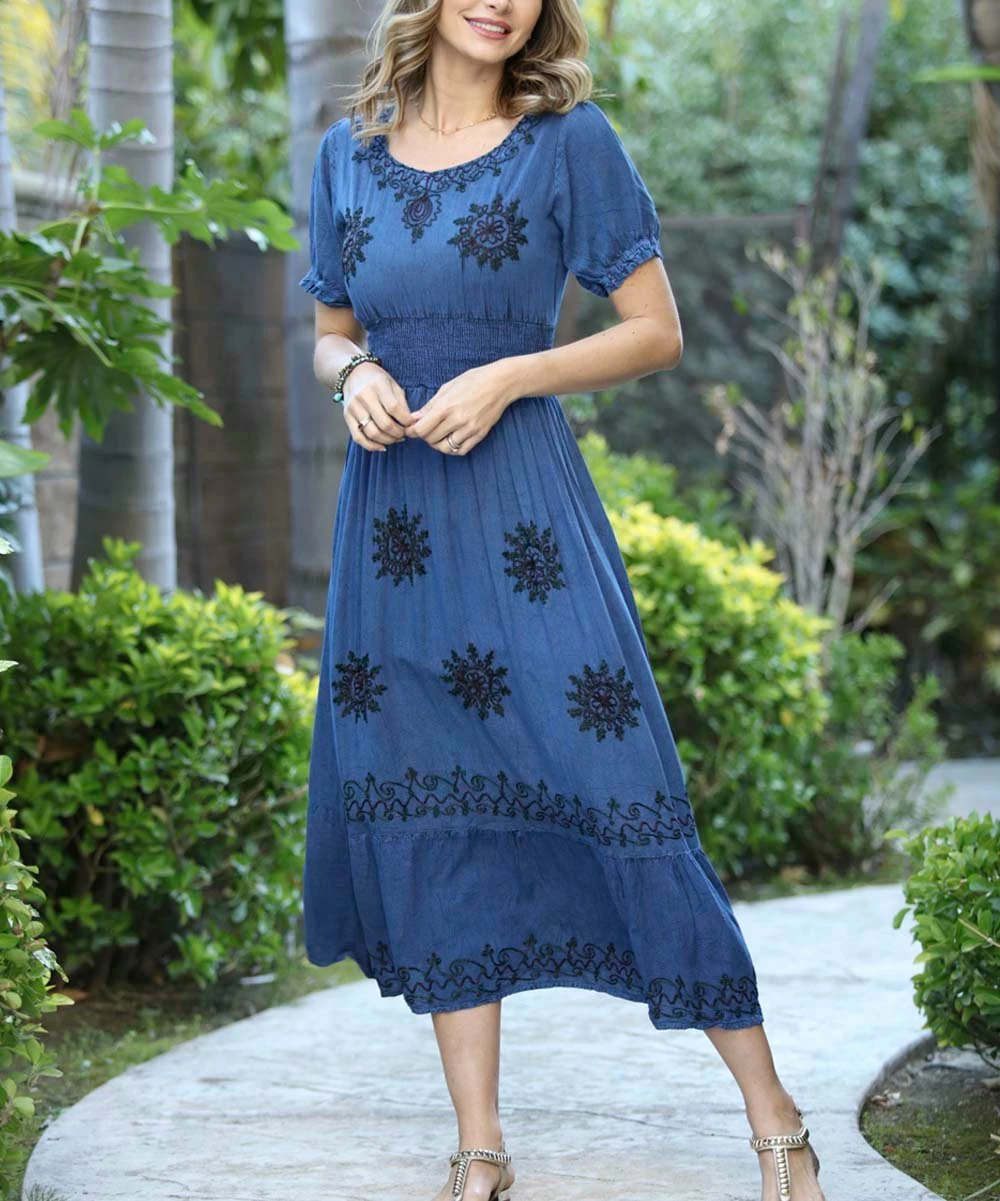 Boost your boho-chic couture with the bold embroidered detail of this breezy A-line dress that gently accentuates your figure with its smocked waistline.