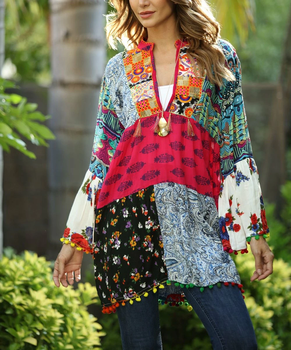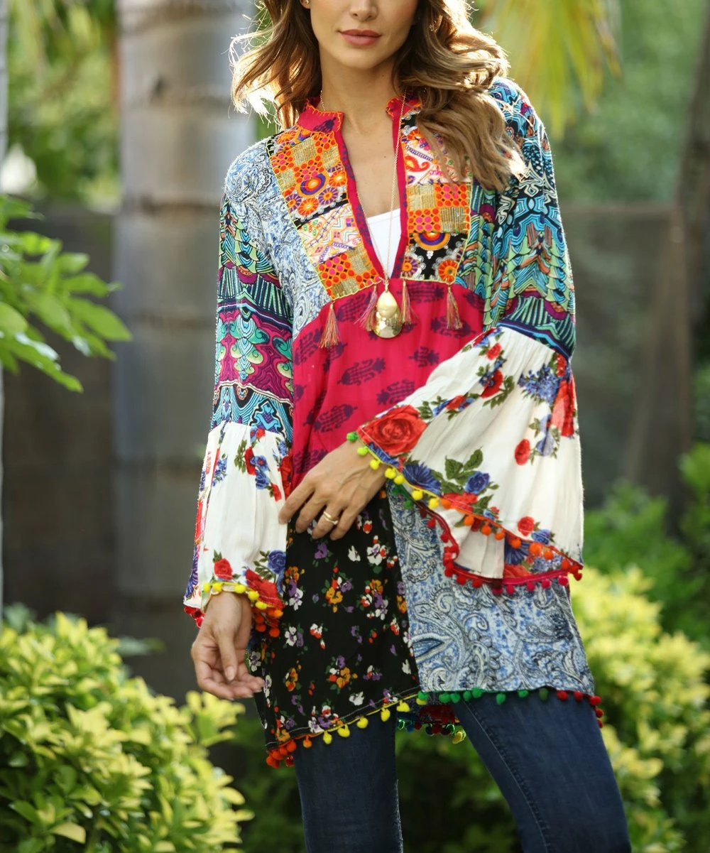 Spend your days in breezy boho-chic style with this vibrant tunic featuring a tiered design and flowing bell sleeves.