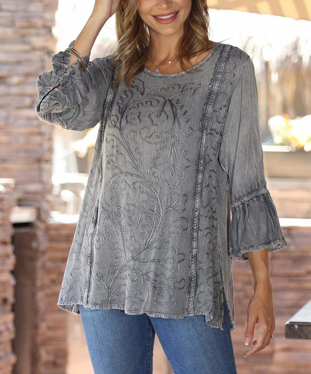 Go boho with this lightweight tunic that boasts dramatic bell sleeves and artful embroidery.
