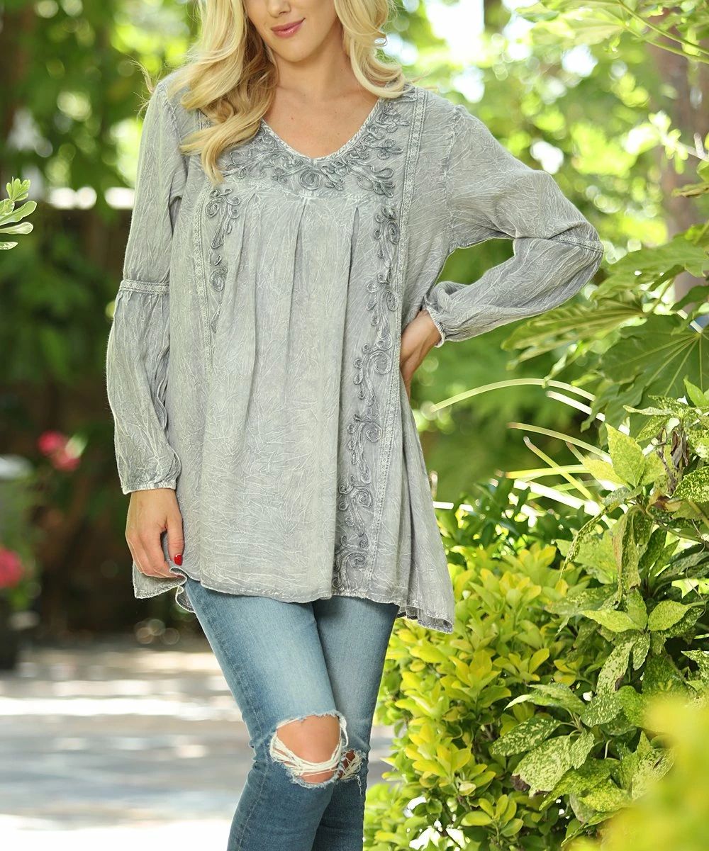 Fill out your casual closet with this soft, breezy tunic featuring a swirl design and billowing bishop sleeves.