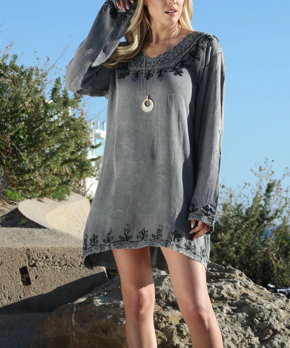 Spend your days in breezy comfort with this soft shift dress that features bohemian embroidery and cozy long sleeves.