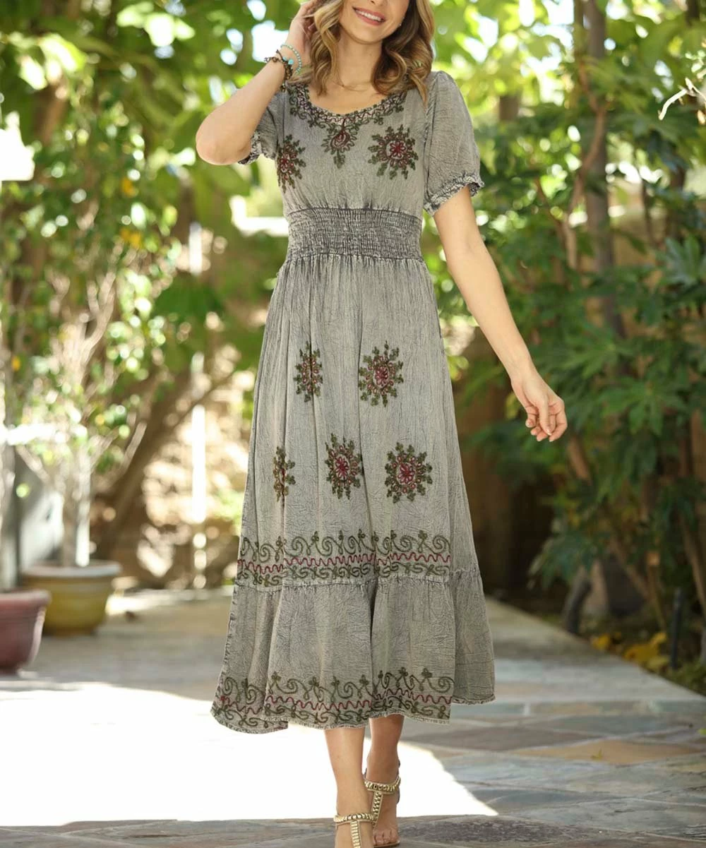 Boost your boho-chic couture with the bold embroidered detail of this breezy A-line dress that gently accentuates your figure with its smocked waistline.