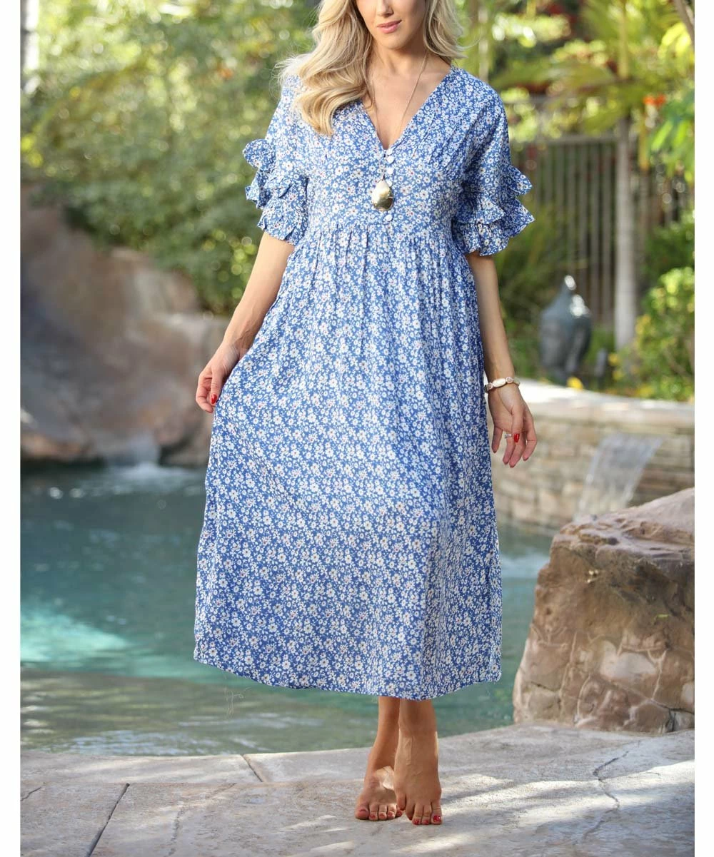 Embrace your free-spirited side with this loose-fitting midi dress that features ruffle-sleeves, a floral pattern and an empire-waist silhouette for a boho-inspired look.