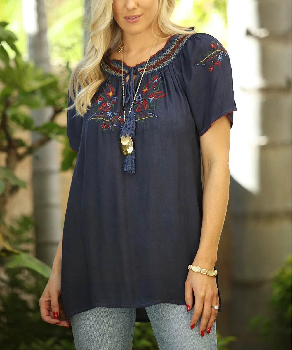 Enjoy the lightweight, breathable fabric of this flowy short-sleeve tunic showcasing delicate embroidered details and a front-tie tassel.