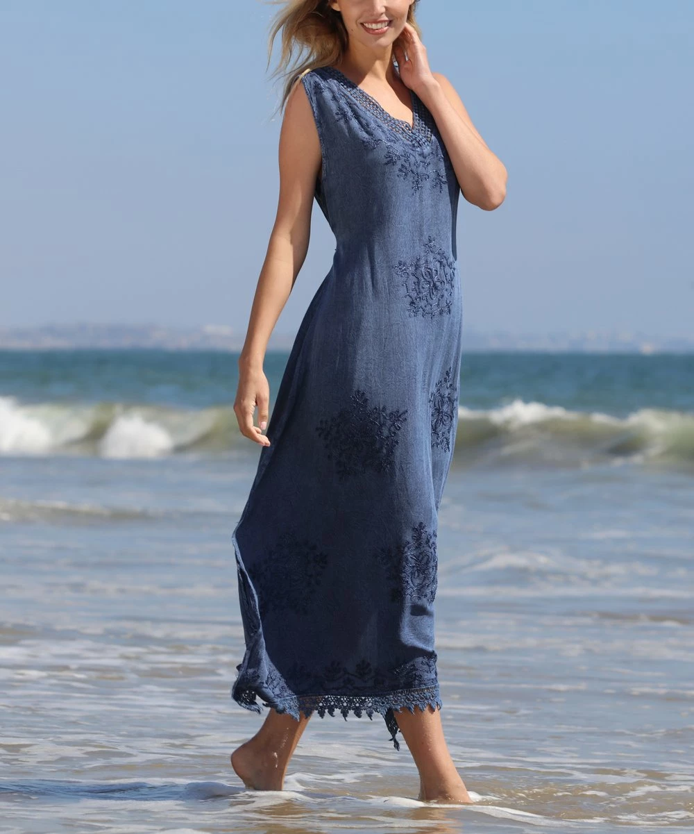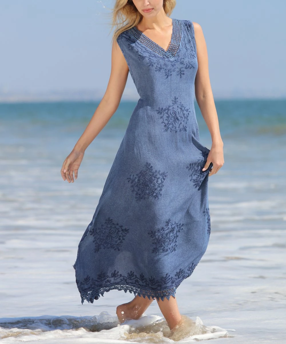 Get your wardrobe ready for warm weather in this breezy dress featuring eye-catching embroidered accents and a flowing fit.