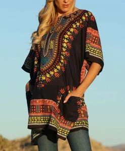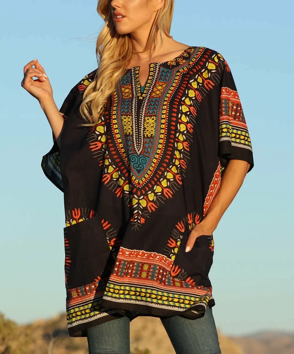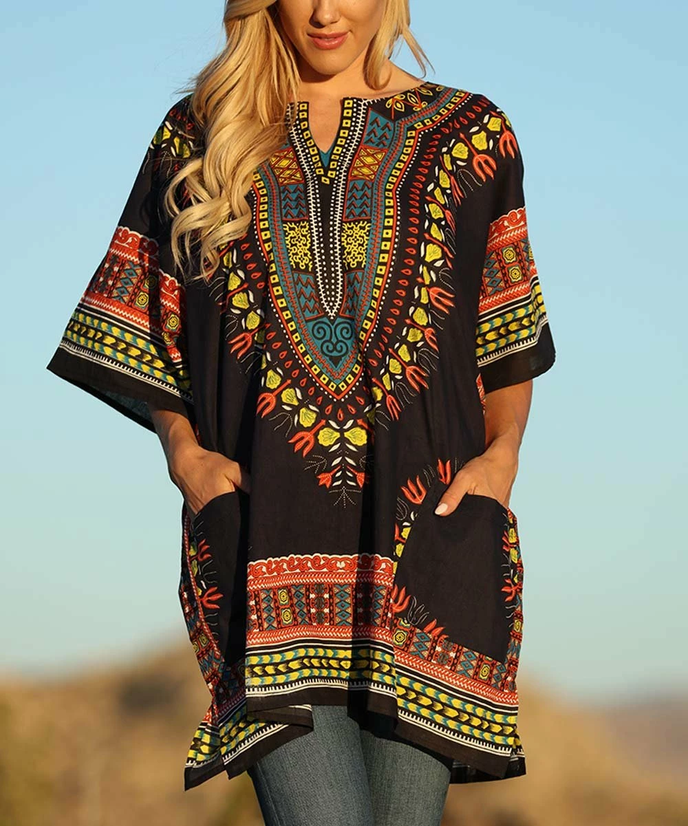 Emanate carefree energy by slipping into this breezy tunic dress boasting convenient front pockets and a spirited motif in vibrant hues.
