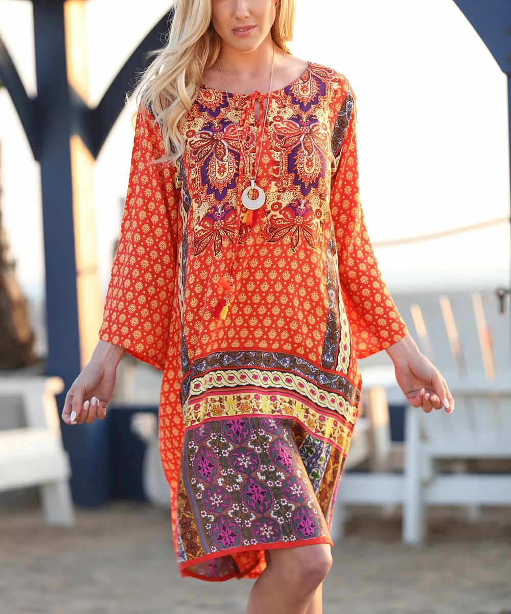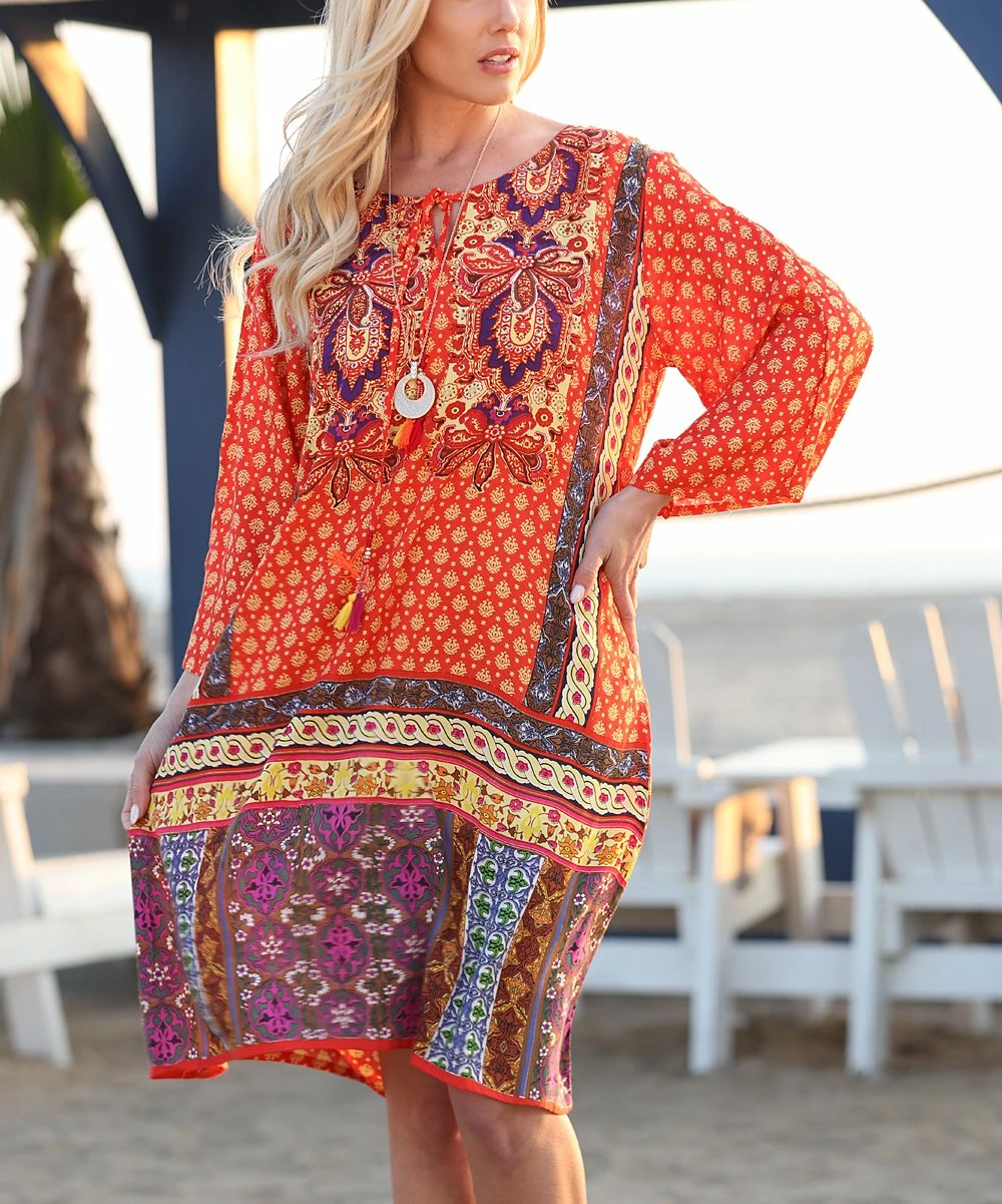 Enhance your boho-chic wardrobe with this flowing shift dress boasting a vibrant pattern.