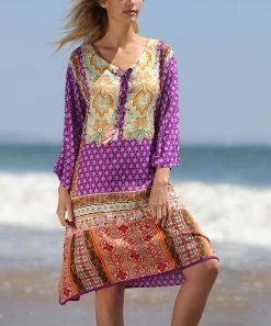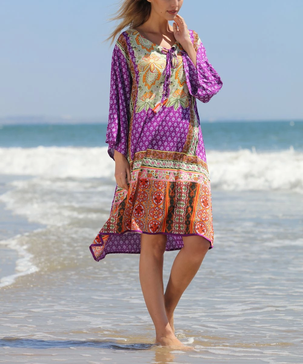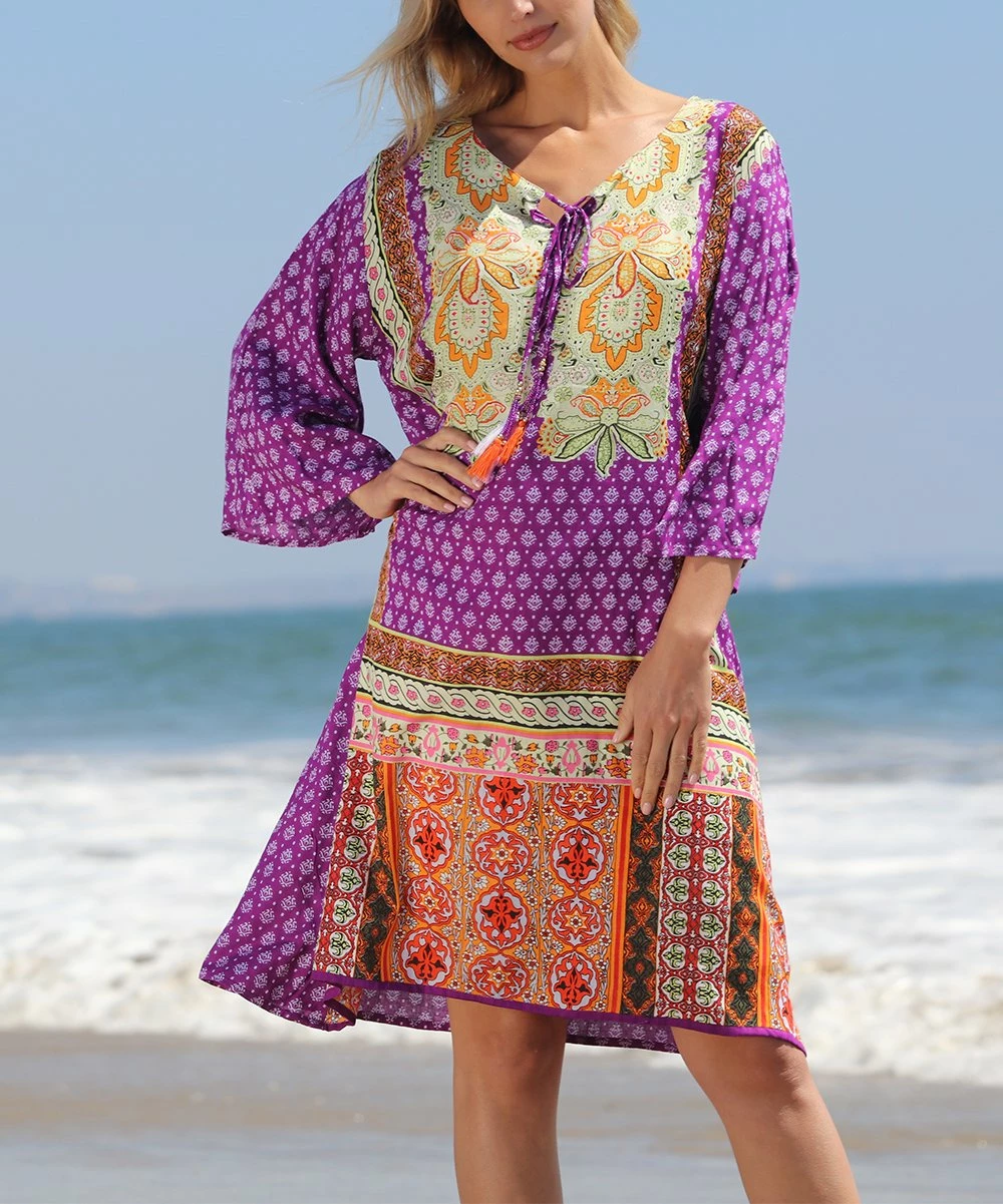 Up your warm weather wardrobe with this vividly designed dress featuring a freely draped fit, tassel-tie detailing and lace-up neckline.
