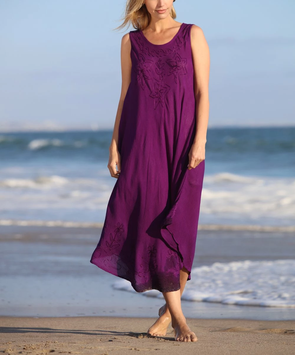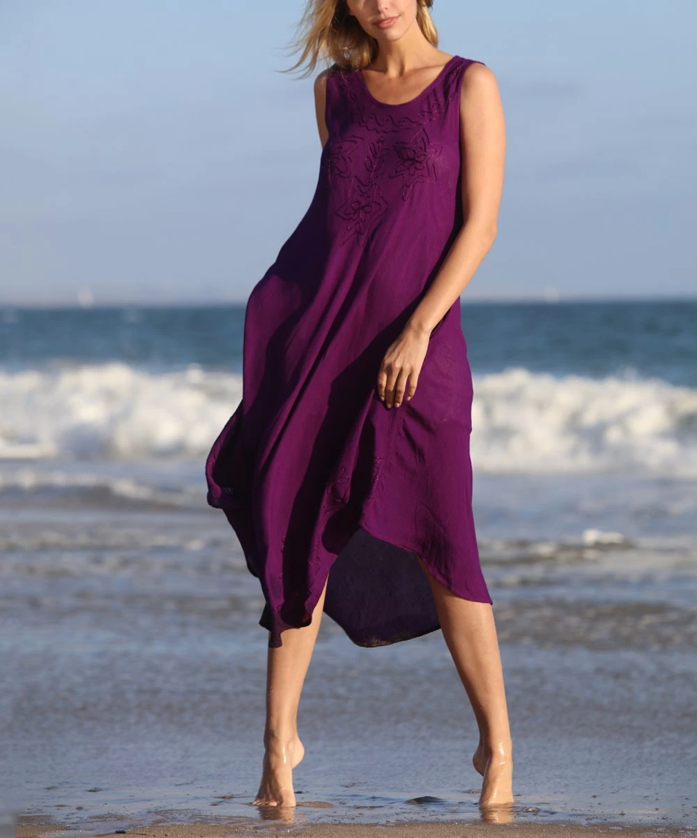 Up your warm weather wardrobe with this crisp dress featuring a freely draped fit and embroidery detailing.