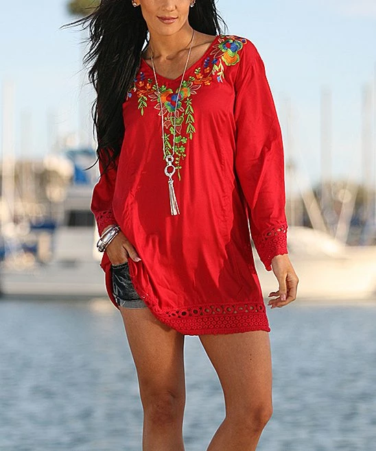 A bright floral-trimmed neckline adds a fresh splash of color to this breezy tunic that flaunts crocheted detail for a boho vibe.