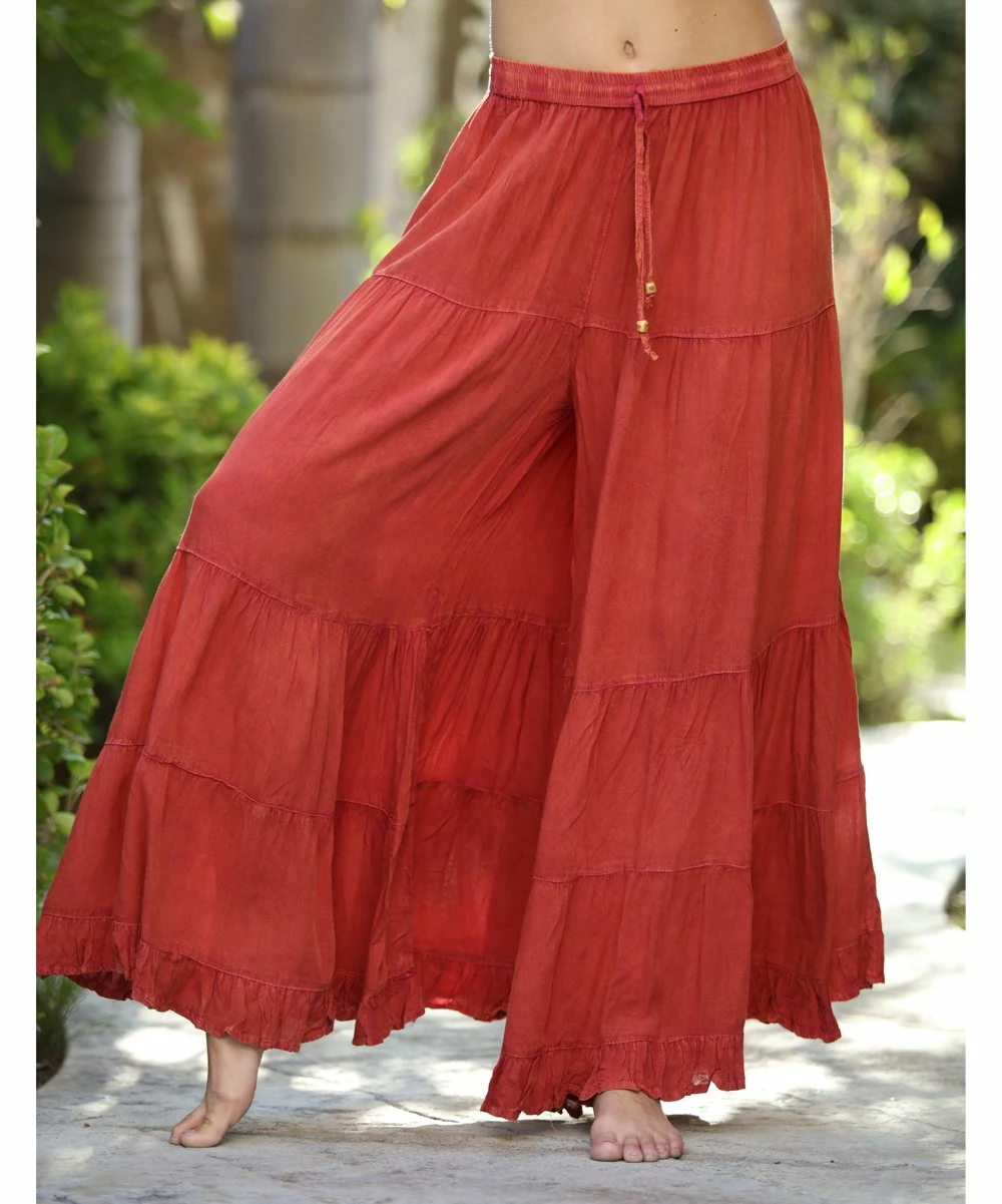Bring some bohemian flair to your closet with these breezy palazzo pants boasting a tiered design and charming ruffle hem.