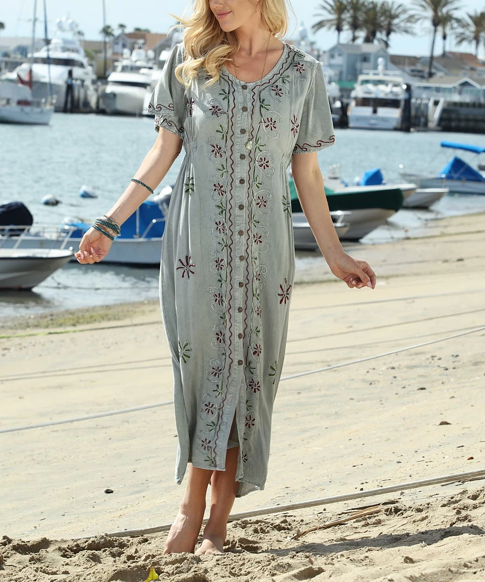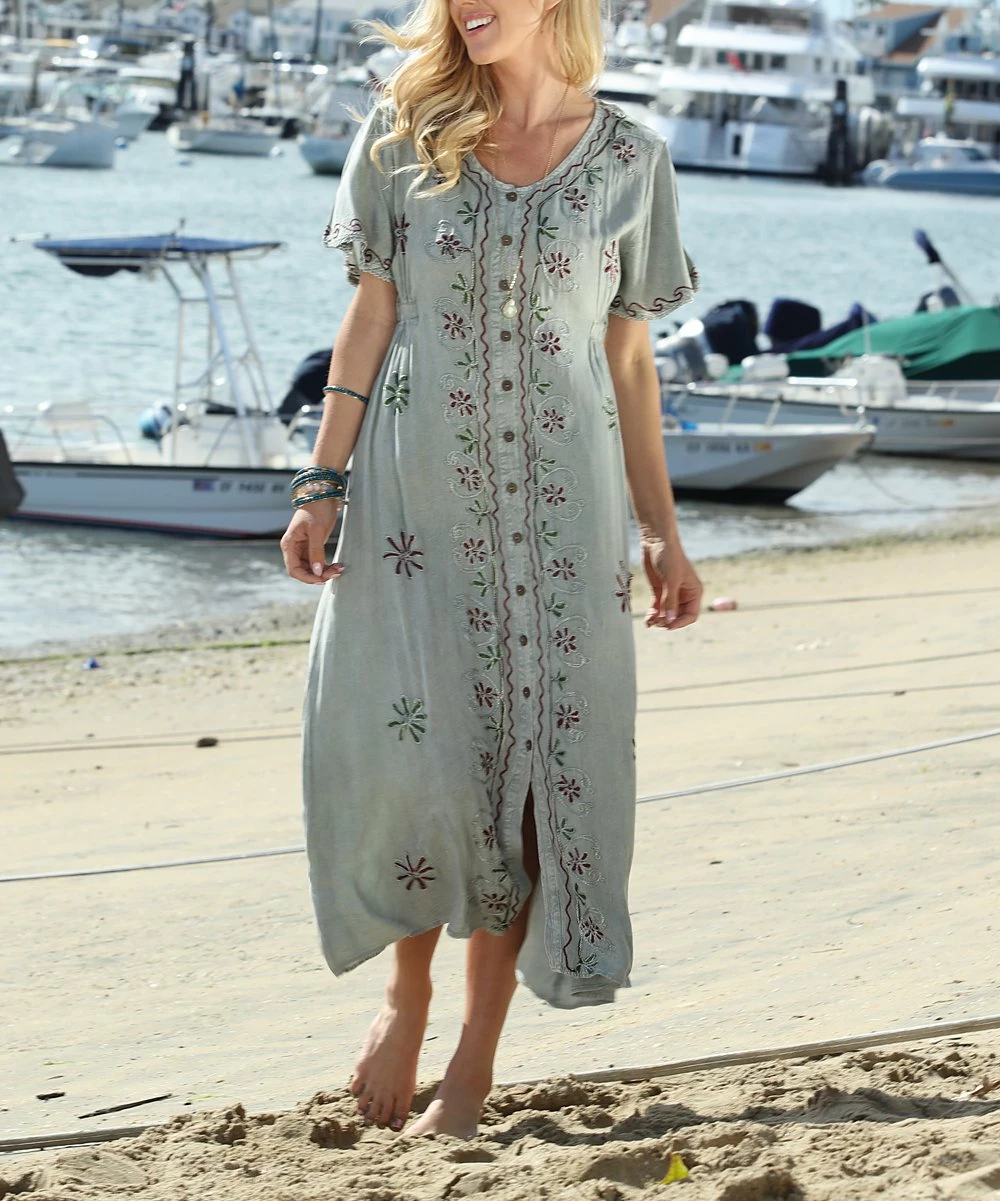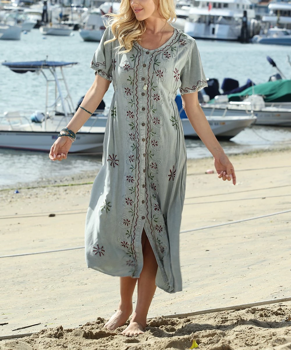 Dress up your casual daytime look with this midi dress featuring intricate embroidered details.