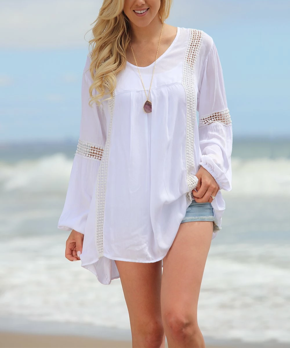 Pierced details add extra easy-breezy style to this lightweight tunic crafted with silk-like softness.