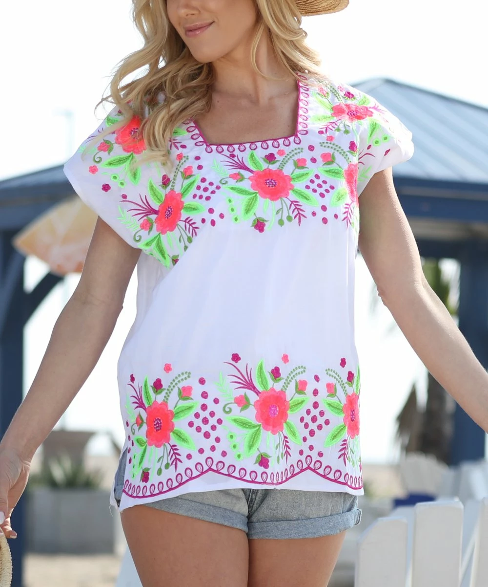 Sweeten your warm-weather wardrobe in this square-neck tunic crafted with soft cotton and colorfully embroidered florals for breezy, boho-chic style.