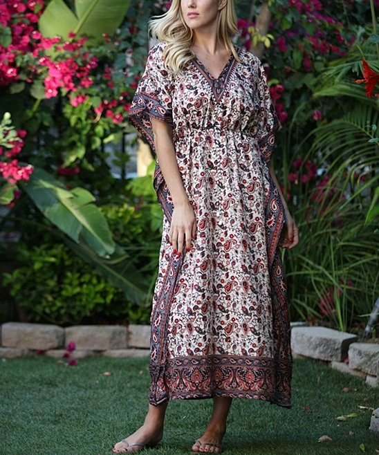 Spend your days in flowing comfort with this breezy caftan sporting a vibrant pattern and a drawstring waist.