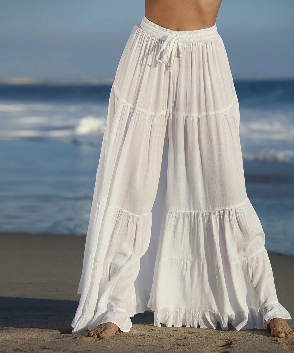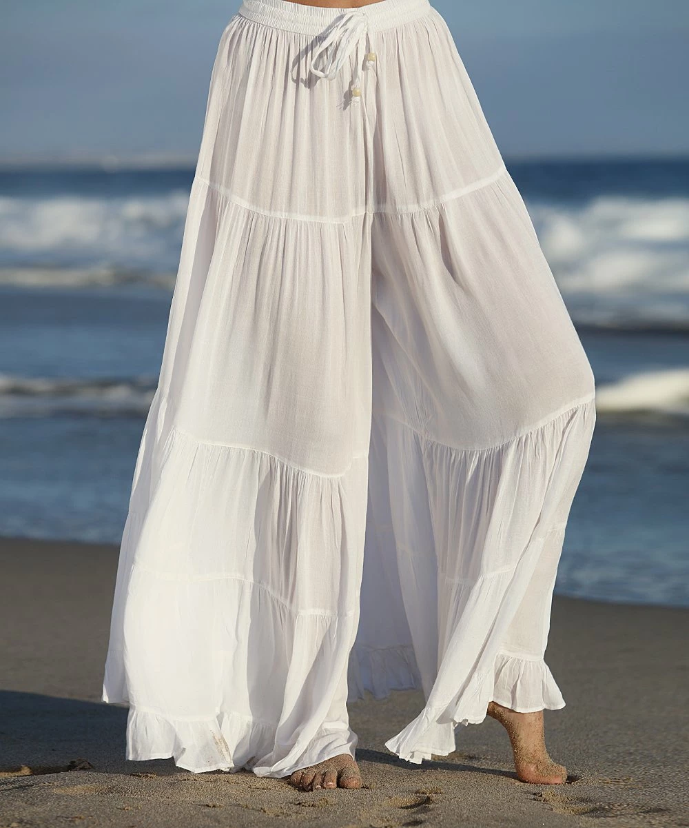 The ruffled accents bring laid-back appeal to these palazzo pants that offer lasting comfort with their roomy fit and adjustable waist.