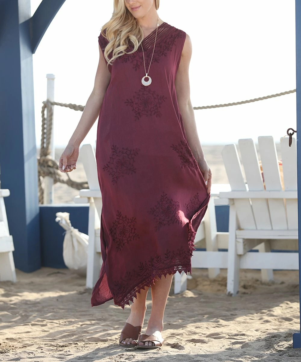 Ananda’s Collection | Wine Embroidered Tassel-Accent Sleeveless Maxi Dress – Women